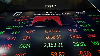 Les informations financières s'affichent tandis que les traders travaillent dans la salle des marchés de la Bourse de New York 1/10/25