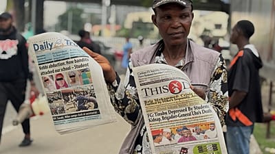 Un vendeur expose des journaux locaux dans les rues de Lagos avec les gros titres sur l'école secondaire publique pour filles, à Kebbi, au Nigeria, le 19 novembre 2025